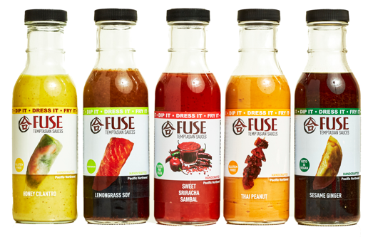 All five Fuse originals: Honey Cilantro, Lemongrass Soy, Thai Peanut, Sesame Ginger, Sriracha Sambal
